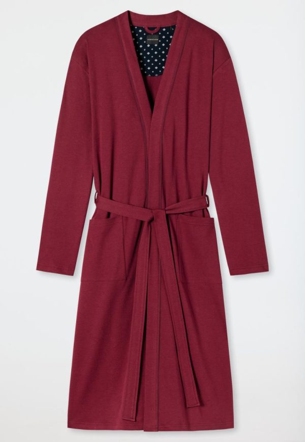 Dieser Herren-Bademantel kombiniert Stil mit hohem Tragekomfort! Feiner Interlock-Stoff aus 100% Bio-Baumwolle sorgt hierbei für ein angenehmes Gefühl auf der Haut und kommt im klassischen Kimono-Schnitt mit gemusterter Paspel gelungen zur Geltung. Zwei aufgesetzte Taschen sowie der Bindegürtel setzen praktische Details. Der ideale Überzieh-Morgenmantel für Daheim – natürlich in bester SCHIESSER-Qualität!