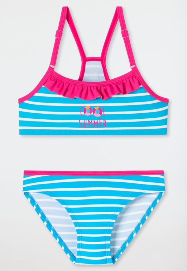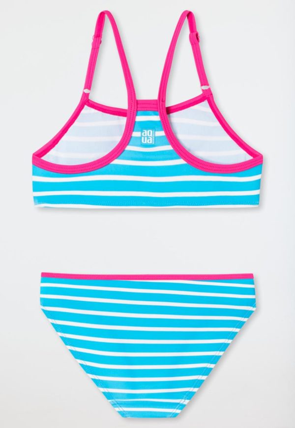 - gestreifter Bustier-Bikini für Mädchen in Hellblau mit Schriftzug in Pink
