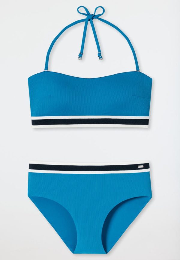 Lässiger Retro-Chic macht dieses Bandeau Bikini-Set in angesagter Ripp-Optik zu einem besonderen Lieblingsstück! Das Top mit seinem modisch gestreiften, elastischen Unterbrustband ist herrlich variabel: Die Träger können gerade, über Kreuz, als Neckholder gebunden oder ganz weggelassen werden. Softpads und Silikonbänder sorgen für Halt. Den sportlichen Look macht der Midi-Slip perfekt, der mit einem Streifen am Bund hübsch abgesetzt ist. Nachhaltige Beachwear in bester SCHIESSER-Qualität!