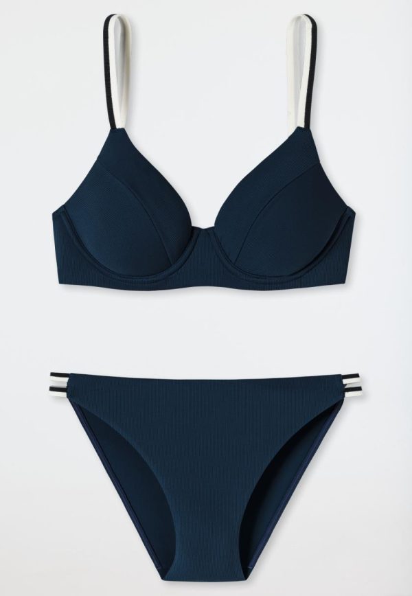- dunkelblaues, gefüttertes Bügel-Bikini-Set für Damen in modischer Ripp-Optik