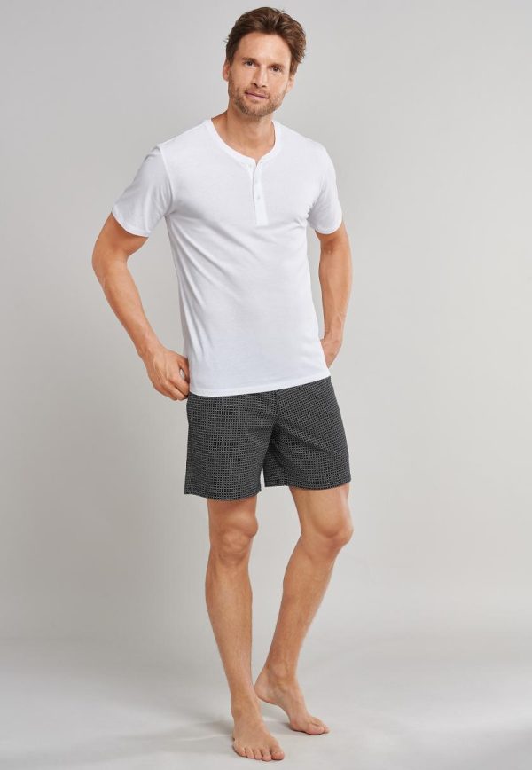 Ob zum Entspannen oder Schlafen, diese schwarz-gemusterten Long Boxer sind immer die richtige Wahl! Die lockeren Herrenshorts überzeugen durch ihr weiches Jersey-Material aus 100 % Baumwolle und sind mit seitlichen Taschen sowie einer funktionalen Knopfleiste ausgestattet. Das Bindeband am elastischen Bund setzt ein weiteres, praktisches Detail. Ein entspanntes Basic in bester SCHIESSER-Qualität!