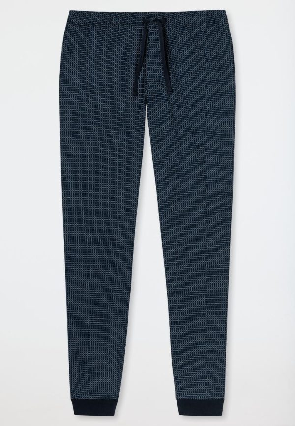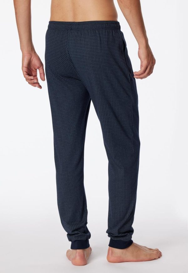 Ob zum Entspannen oder Schlafen, diese dunkelblau-gemusterte Herrenhose ist immer die richtige Wahl! Die lockere Jogginghose überzeugt durch ihr weiches Jersey-Material aus 100 % Baumwolle und ist mit seitlichen Taschen sowie einer funktionalen Knopfleiste ausgestattet. Das dunkelblaue Bindeband am elastischen Bund und die Bündchen-Abschlüsse am Bein setzen weitere, praktische Details. Ein bequemes Basic in bester SCHIESSER-Qualität!