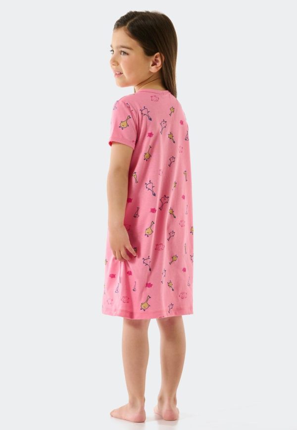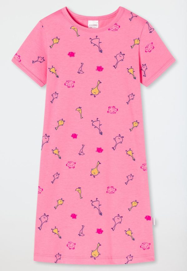 Dieses pinkfarbene Kurzarm-Nachthemd für Mädchen verspricht jede Menge tierische Träume! Mit seinem niedlichen und frischen Allover-Muster aus Gänsen und kleinen Schweinchen zaubert die Nachtwäsche jedem ein Lächeln beim Zubettgehen ins Gesicht. In 100% hautfreundlicher Bio-Baumwolle lässt es sich herrlich entspannen und auch in wärmeren Nächten bestens zur Ruhe kommen. Ein hübsches Sleepshirt mit ganz viel Natürlichkeit in bester SCHIESSER-Qualität.