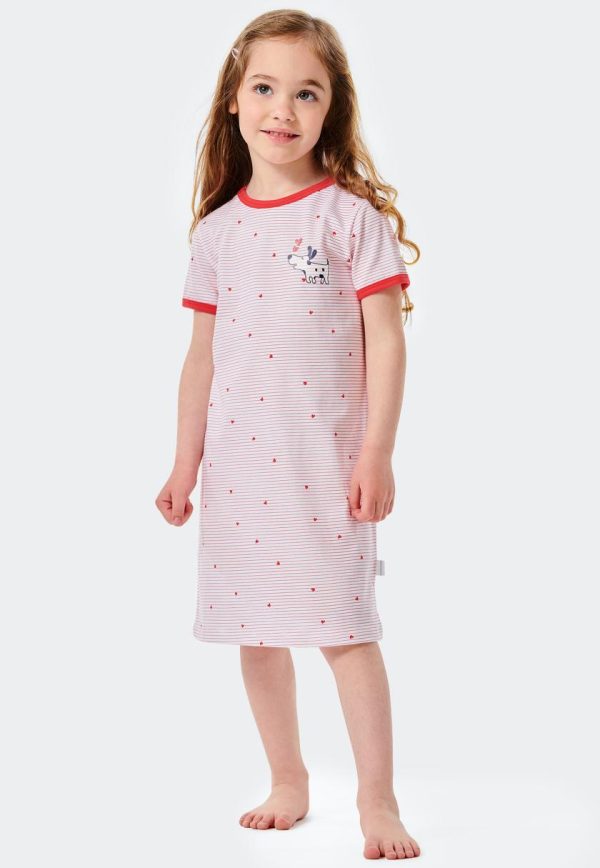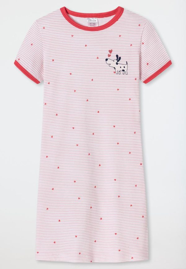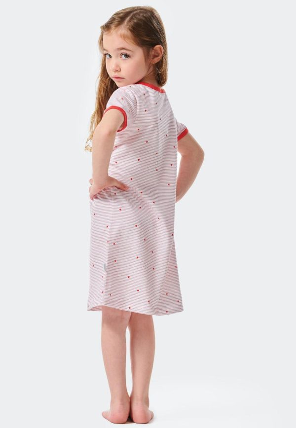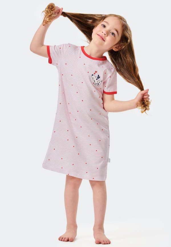 Dieses weiße Kurzarm-Nachthemd für Mädchen verspricht jede Menge süße Träume! Mit seinem niedlichen Ringel-Look und zauberhaften Herzen in Rot zaubert die Nachtwäsche jedem ein Lächeln beim Zubettgehen ins Gesicht. Ein echter Hingucker ist das kleine gefleckte Hündchen auf der Brust. In 100% hautfreundlichem Organic Cotton können kleine Traumtänzerinnen auch in wärmeren Nächten entspannt zur Ruhe kommen. Beste SCHIESSER-Qualität inklusive!