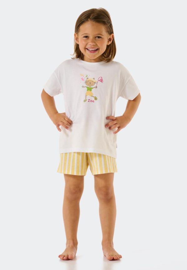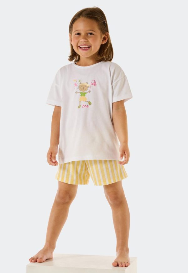 So schön ist der Sommer bei SCHIESSER! Dieser kurze Mädchenschlafanzug strahlt mit der Sonne um die Wette. Auf dem weißen Oberteil geht unser Liebling Cat Zoe auf Libellen-Fang und sorgt im coolen Outfit für jede Menge gute Laune. Die kurze gestreifte Schlafhose im Vanille-Ton ist modisch ein echter Hingucker und sitzt dank softem Bund und lässigem Schnitt jederzeit perfekt am Körper. Ein fröhliche Nachtwäsche aus 100% weicher Bio-Baumwolle zum Träumen und Verlieben.