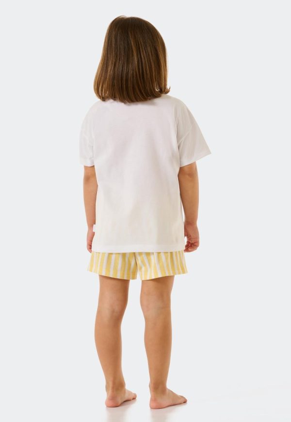 - kurzer Mädchenschlafanzug in Weiß mit Libellen-Motiv und gestreifter Schlafhose in Vanille