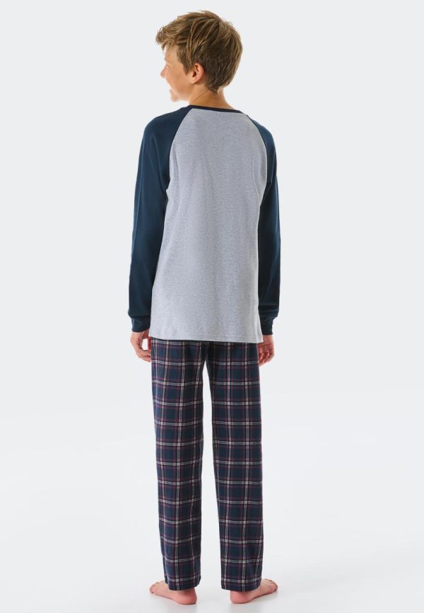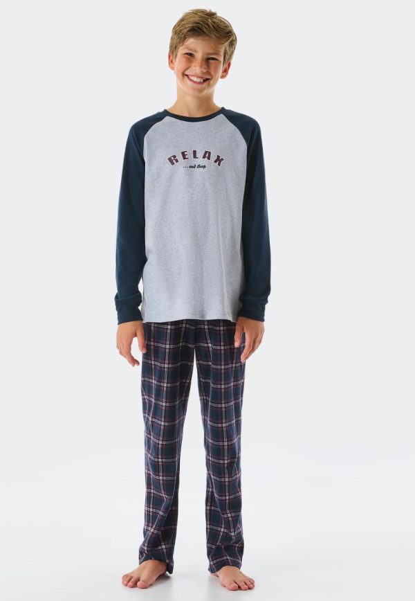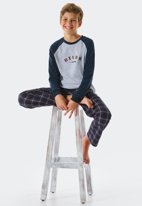 - langer, grau-melierter Jungenschlafanzug mit „RELAX … and sleep“-Schriftzug und karierter Hose