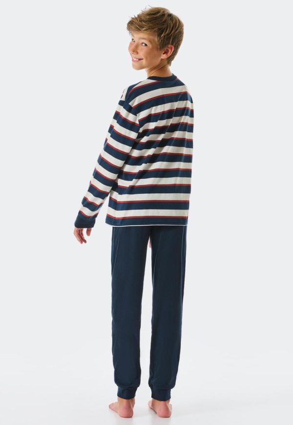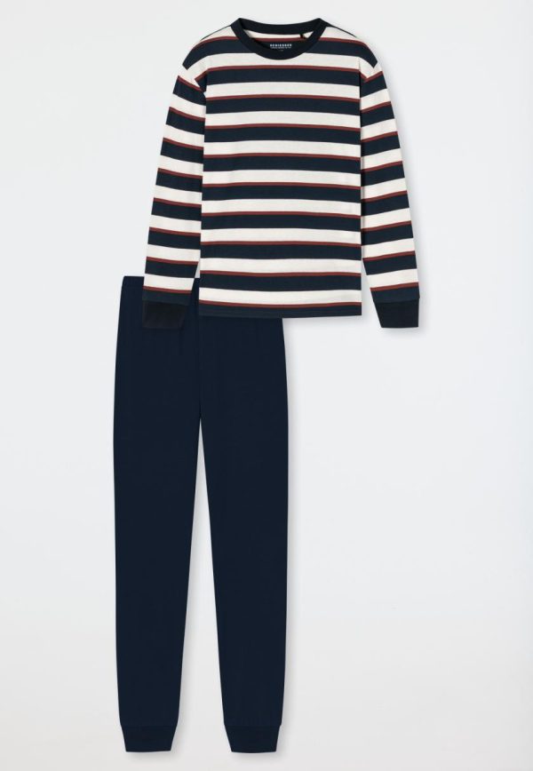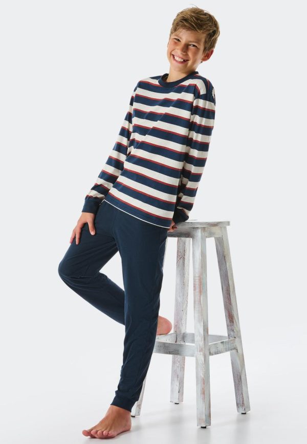 - langer Jungenschlafanzug mit gestreiftem Langarmshirt in Nachtblau, Braun und Off-white