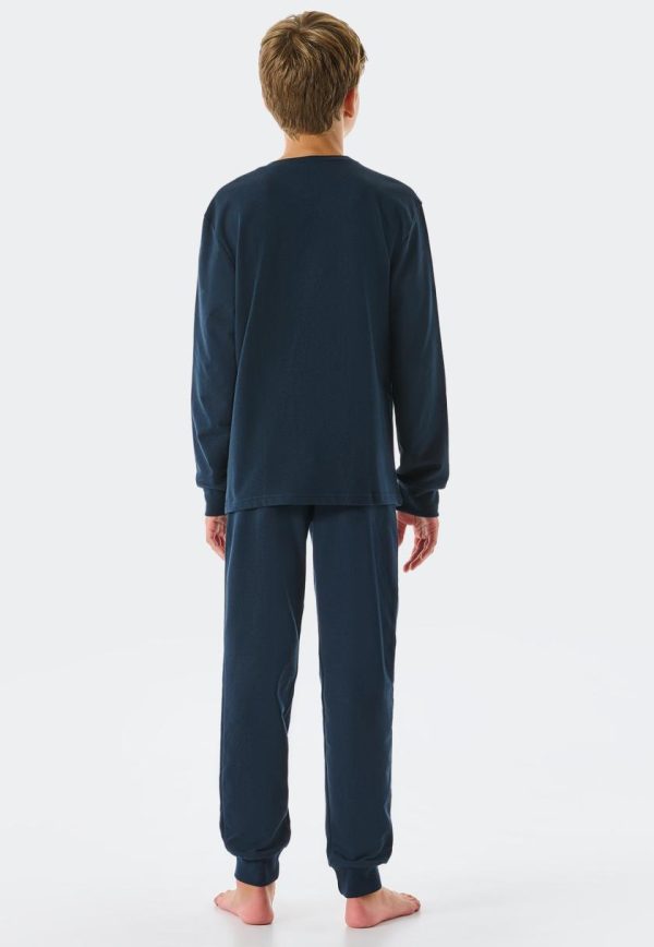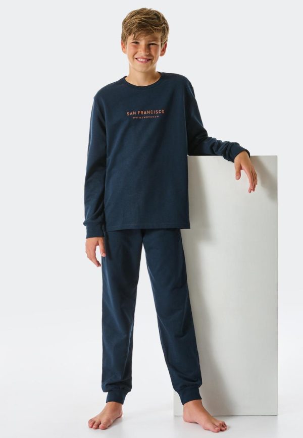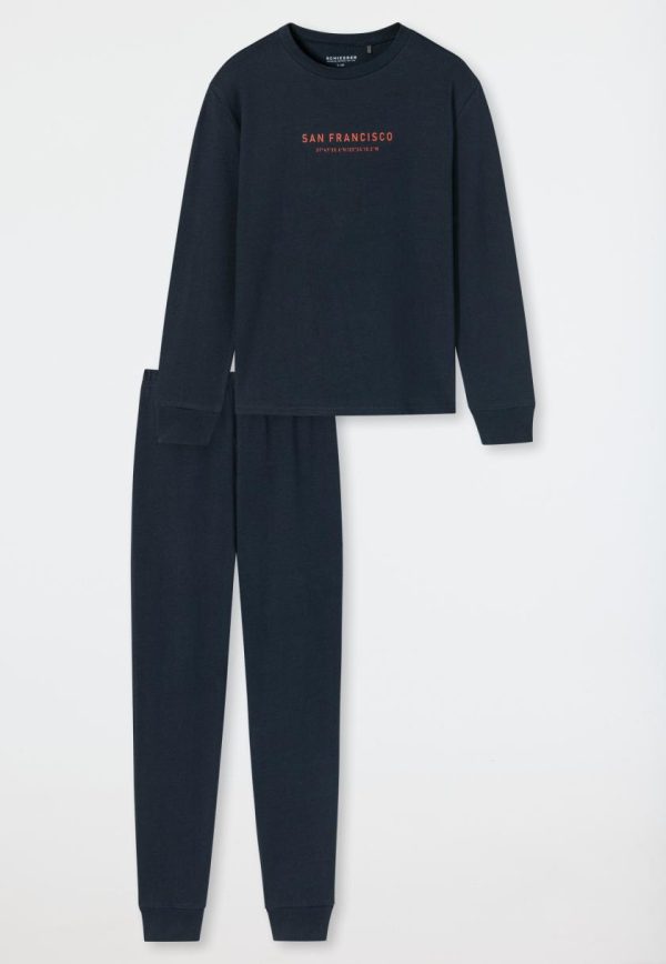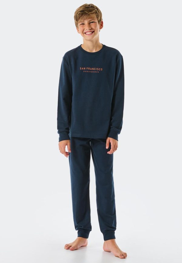 - langer, nachtblauer Jungenschlafanzug mit orangefarbenem „SAN FRANCISCO“-Schriftzug und Koordianten