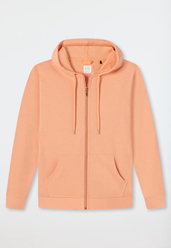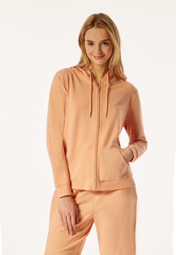 Ob beim Sport oder beim Relaxen zuhause: In dieser pfirsichfarbenen Damen-Sweatjacke machen Sie immer eine gute Figur! Modische Details sind die Kapuze mit Kordelzug, die Taschen und der kupferfarbene Zipper. Komfort versprechen auch die gerippten Bündchen an Ärmeln und Saum. Das Lieblingsstück punktet zudem mit Nachhaltigkeit und innovativer Technologie: Die elastische Sweatware ist aus natürlichem, widerstandsfähigem Tencel und recycelter Baumwolle gemacht. Beste SCHIESSER-Qualität!