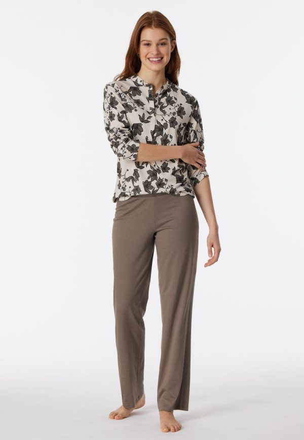 - sandfarbener, langer Damen-Schlafanzug mit Blumenprint