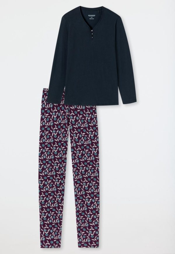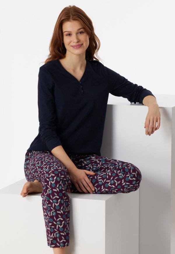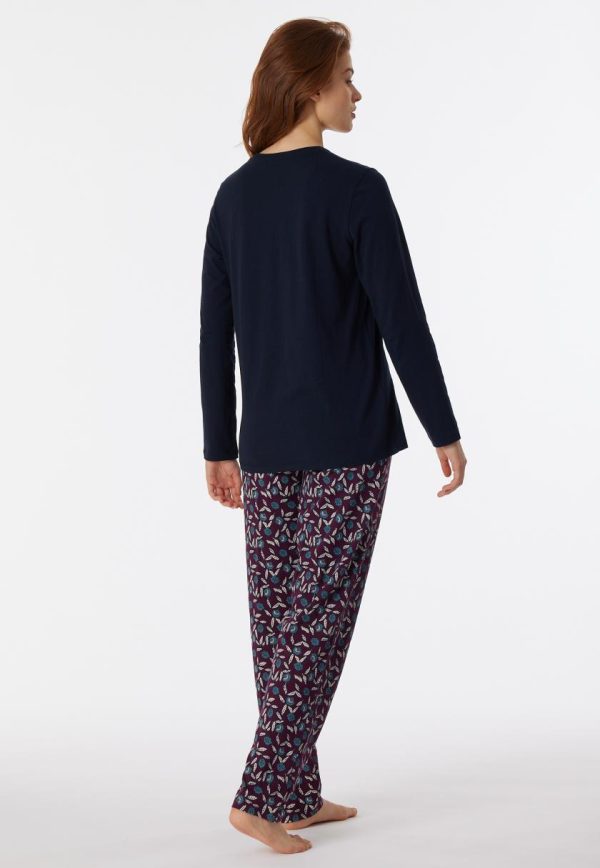 - nachtblauer, langer Damen-Schlafanzug mit Hose mit Blumenprint