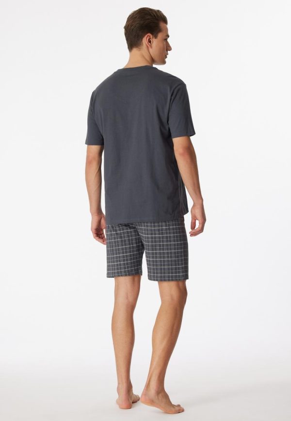 Dieser kurze, graue Schlafanzug punktet bei anspruchsvolle Herren durch ein stilvolles Design und 100% weiche Baumwolle. Das Oberteil mit V-Ausschnitt und Brusttasche bekommt mit der kurzen Hose mit grau-weißem Karomuster einen starken Partner, der mit einem Bindeband am Hosenbund ein praktisches Details mitbringt. Locker-leichter Single Jersey übernimmt den komfortablen Part und verspricht angenehme Nächte in bester SCHIESSER-Qualität!