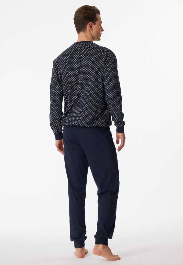 Bei diesem langen, dunkelblauen Herrenschlafanzug steht hoher Tragekomfort an oberster Stelle! Feiner Jersey aus 100% Baumwolle fühlt sich dabei angenehm weich an und wird mit den Bündchenabschlüssen stimmig abgerundet. Und auch optisch kann der Zweiteiler punkten: Ein weiß-grauer Minimal-Print schenkt dem Oberteil seinen maskulinen Charakter und bekommen mit der aufgesetzten Brusttasche ein feines Details. Genau das Richtige für entspannte Nächte – auch in besonderen Größen erhältlich!