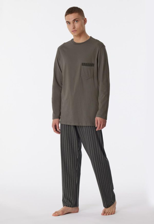 - langer, taupefarbener Herren-Schlafanzug mit gestreifter Hose in Taupe, Anthrazit und Off-white