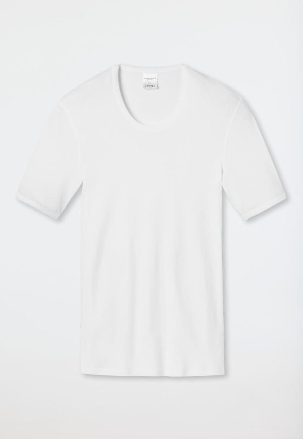 Langlebig, strapazierfähig, in bester SCHIESSER-Qualität: Dieses weiße Herren-T-Shirt verkörpert alles, was anspruchsvolle Männer sich von einem klassischen Unterzieh-Shirt wünschen. 100% supergekämmte Baumwolle in Feinripp-Qualität fühlt sich dabei nicht nur besonders weich an auf der Haut, sondern garantiert zudem gleichbleibende, hochwertige Haptik und Optik selbst nach vielen Wasch- und Trocknergängen. Das ideale T-Shirt für Herren, die maskuline Basics im puren Look schätzen.