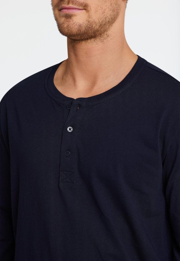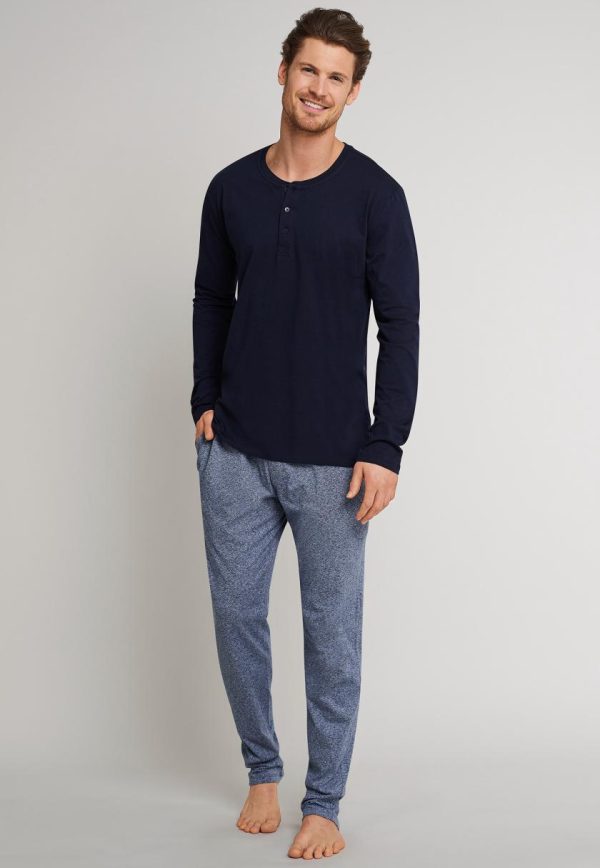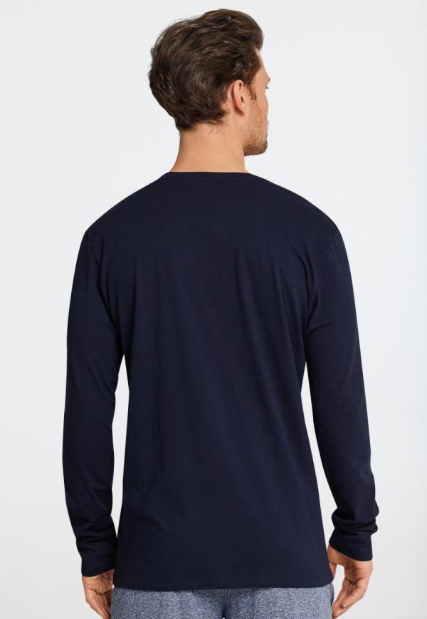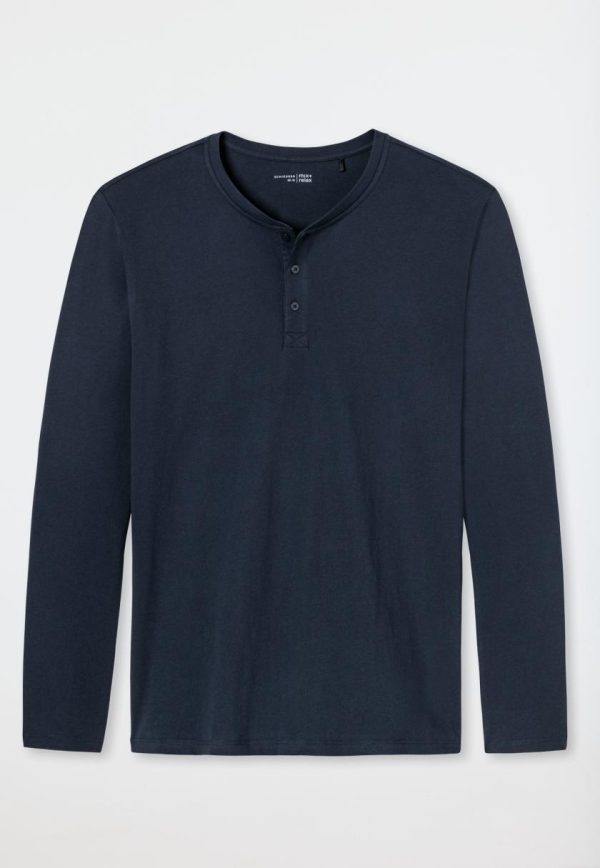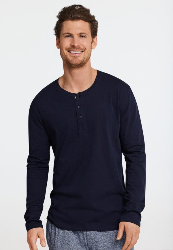 Dieses dunkelblaue Herren-Langarmshirt aus der beliebten Mix+Relax Serie strahlt pure Lässigkeit aus! Der Serafino-Kragen mit funktionaler Knopfleiste schenkt dem Longsleeve dabei seinen typischen Henley-Charakter. Dank weichem Single Jersey aus 100 % Baumwolle ist für hohen Tragekomfort gesorgt. Genau das Richtige für entspannte Tage und Nächte – natürlich in bester SCHIESSER-Qualität! Auch in großen Größen erhältlich.