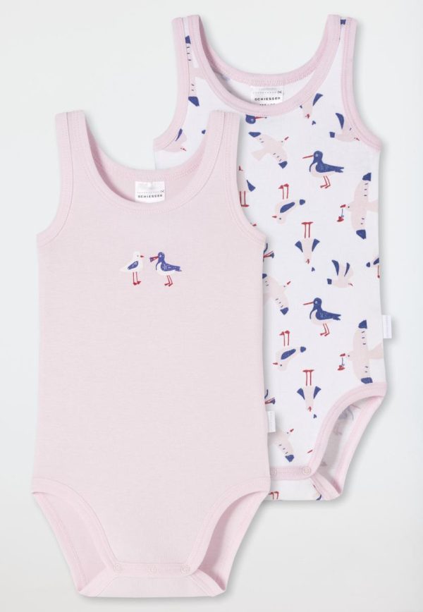 Diese ärmellosen Mädchen-Babybodys sind genau das Richtige für warme Sommertage! Ob in Rosa mit kleinem Möwen-Pärchen auf der Brust oder in Weiß mit tierischem Allover – dieses Duo sieht einfach nur zuckersüß aus. Hochwertiges Feinripp-Material aus 100% Organic Cotton umscheichelt die zarte Babyhaut und sorgt für ein tolles Tragegefühl. Eine herrlich bequeme Tagwäsche um am Strand oder der Krabbeldecke auf Entdeckungsreise zu gehen. Natürlich in bester SCHIESSER-Qualität!