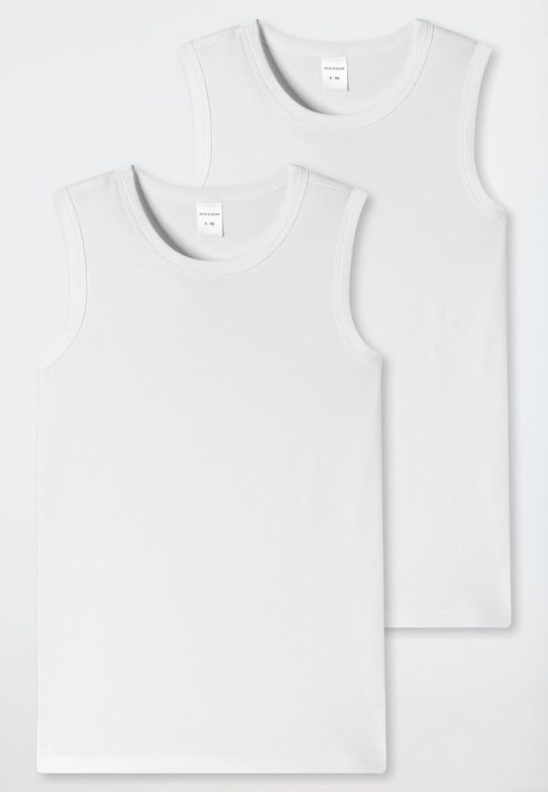 In diesem Doppelpack erwarten coole Boys zwei superbequeme, weiße Shirts im schlichten Look. Natürlich stimmt auch das Feeling, denn die beiden Unterhemden fühlen sich dank elastischem Single Jersey aus Organic Cotton wunderbar weich an und machen dank der breiten Träger jede Bewegung garantiert bequem mit! Ein legeres Wäsche-Duo in bester SCHIESSER-Qualität!