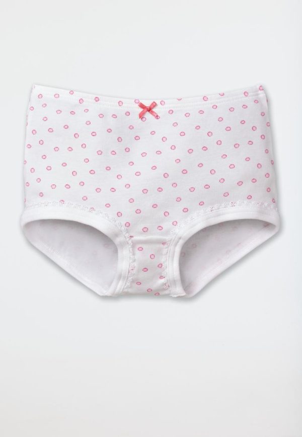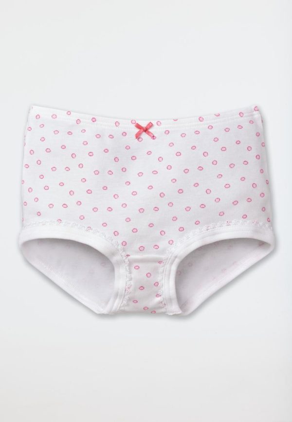 Tupfen zum Verlieben: Diese weißen Mädchenshorts wickeln fröhliche Girls mit ihrem zauberhaften Look und softem Material um den Finger! Rosafarbene Tupfen, ein feines Schleifchen und die zarte Verzierung am Beinabschluss schenken der Panty nicht nur einen mädchenhaften Charme, sondern fühlen sich in hochwertiger, elastischer Feinripp-Qualität dabei auch noch herrlich weich und anschmiegsam an! Ideal für Mädels, die traumhaft-süße Wäsche in bester SCHIESSER-Qualität mögen!