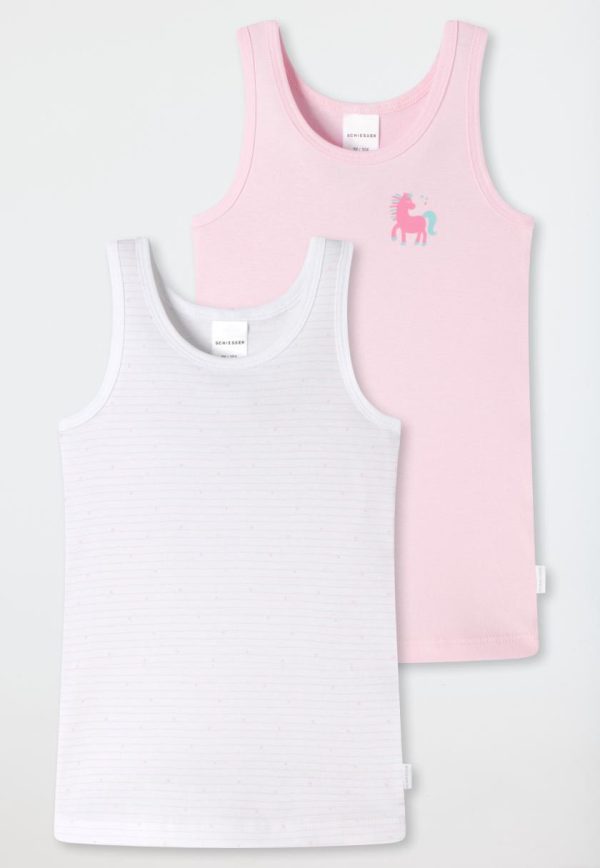 Einfach bezaubernd! Diese beiden Mädchen-Unterhemden sorgen gleich im Doppelpack für Herzklopfen. Das hochwertige Feinripp-Material aus 100% Organic Cotton fühlt sich besonders weich und angenehm auf der empfindlichen Kinderhaut an. Ob mit süßem Pferdchen auf der Brust oder fein geringelt mit Sternen-Allover – dieses Tagwäsche-Duo garantiert ein herrliches Tragegefühl und ganz viel Komfort. Für unsere kleinen Schätze nur das Beste in natürlicher SCHIESSER-Qualität!